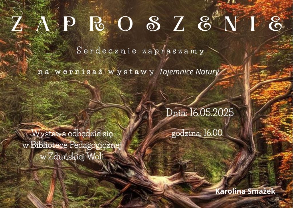 Z ogromną przyjemnością zapraszamy na wernisaż wystawy Pani Karoliny Smażek pt. „Tajemnice Natury”, który odbędzie się w Bibliotece Pedagogicznej w Zduńskiej Woli w dniu 16.05.2025 r. o godz. 16.00.
