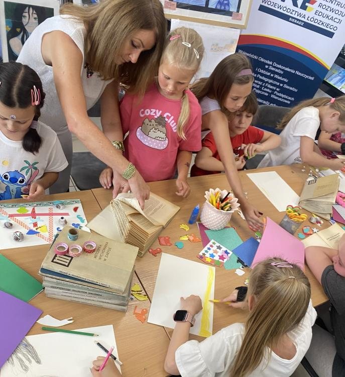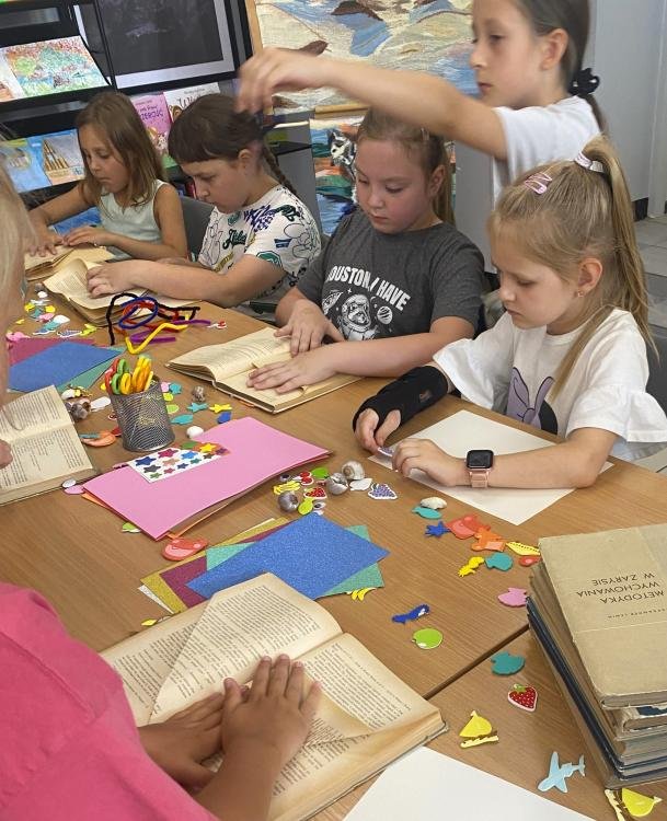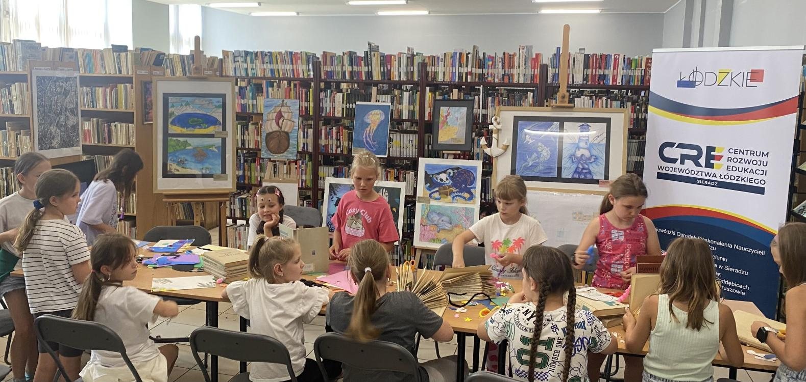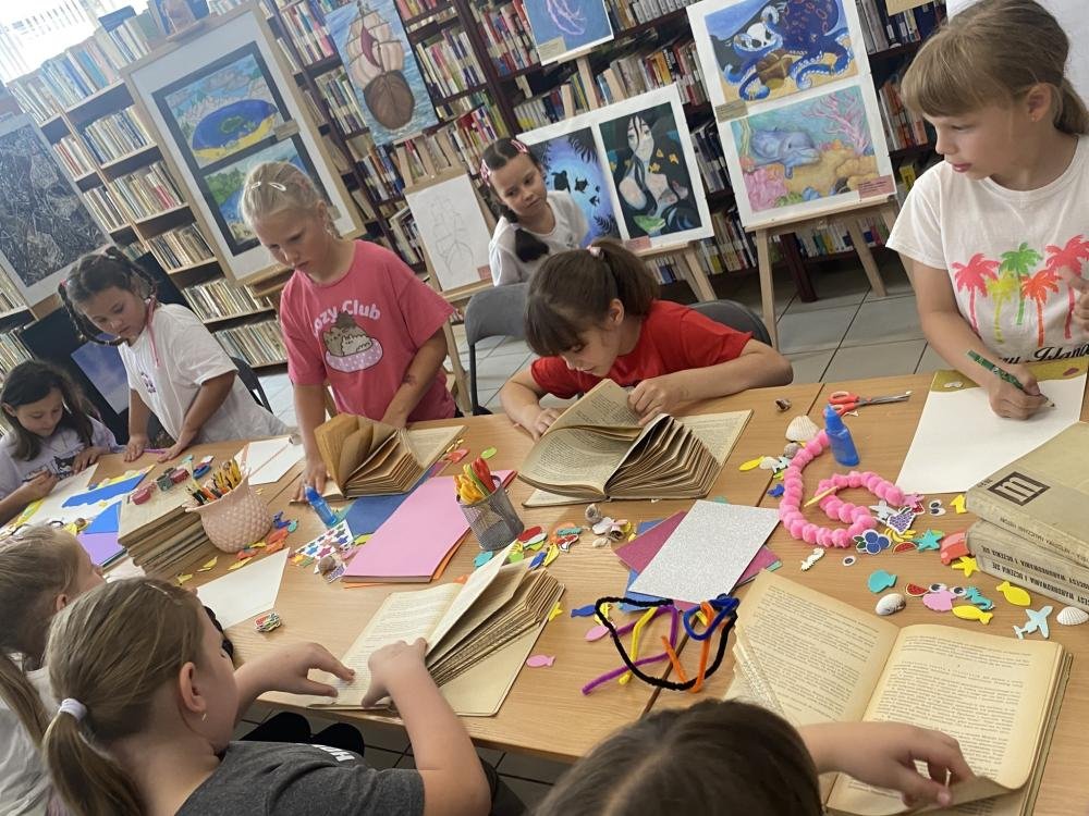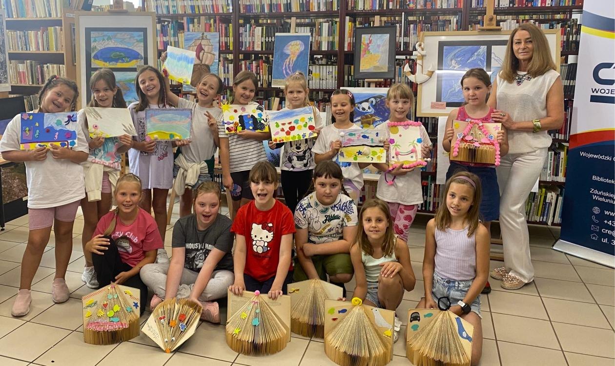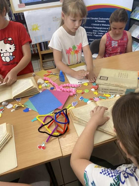 Nasza Biblioteka tętniła w poniedziałkowy poranek twórczą energią. A to za sprawą dzieci uczęszczających na zajęcia Powiatowego Artystycznego Lata WAL-a w Zduńskiej Woli. Dzieci z ogromnym zaangażowaniem tworzyły wakacyjne pocztówki i kolorowe obrazki. Z wykorzystaniem starych książek powstały również pomysłowe letnie stworki – każdy z nich miał swój własny, niepowtarzalny charakter. Wszystko ozdobione zostało muszelkami, konikami morskimi, letnimi owocami i łódeczkami. To były zajęcia pełne wyobraźni, radości i dobrej zabawy.