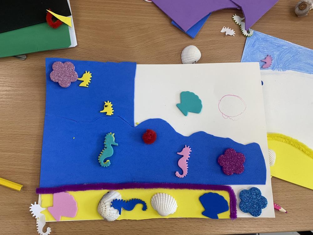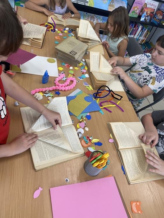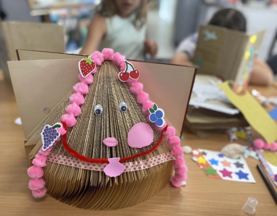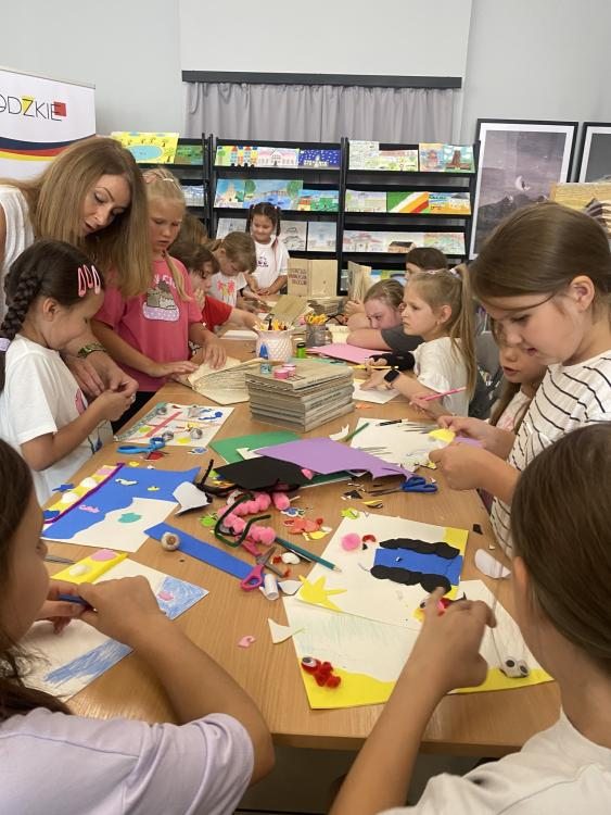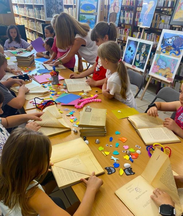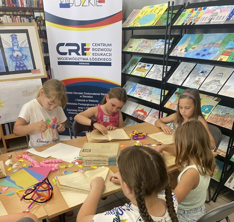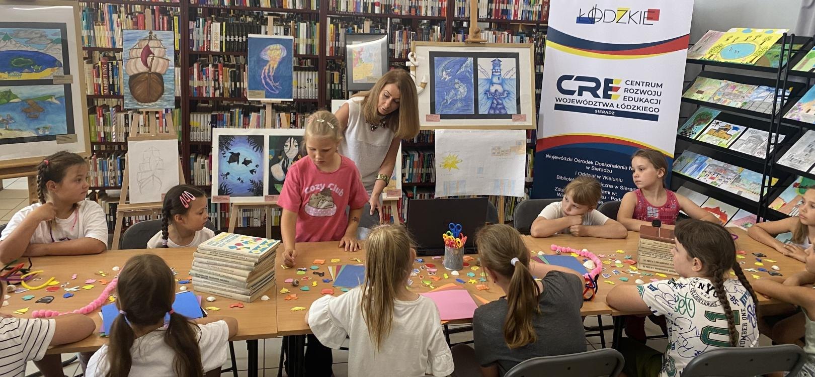 Nasza Biblioteka tętniła w poniedziałkowy poranek twórczą energią. A to za sprawą dzieci uczęszczających na zajęcia Powiatowego Artystycznego Lata WAL-a w Zduńskiej Woli. Dzieci z ogromnym zaangażowaniem tworzyły wakacyjne pocztówki i kolorowe obrazki. Z wykorzystaniem starych książek powstały również pomysłowe letnie stworki – każdy z nich miał swój własny, niepowtarzalny charakter. Wszystko ozdobione zostało muszelkami, konikami morskimi, letnimi owocami i łódeczkami. To były zajęcia pełne wyobraźni, radości i dobrej zabawy.