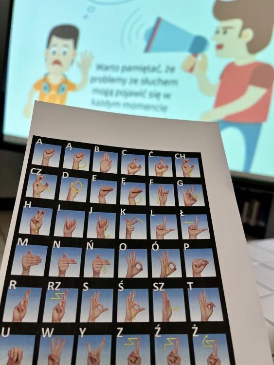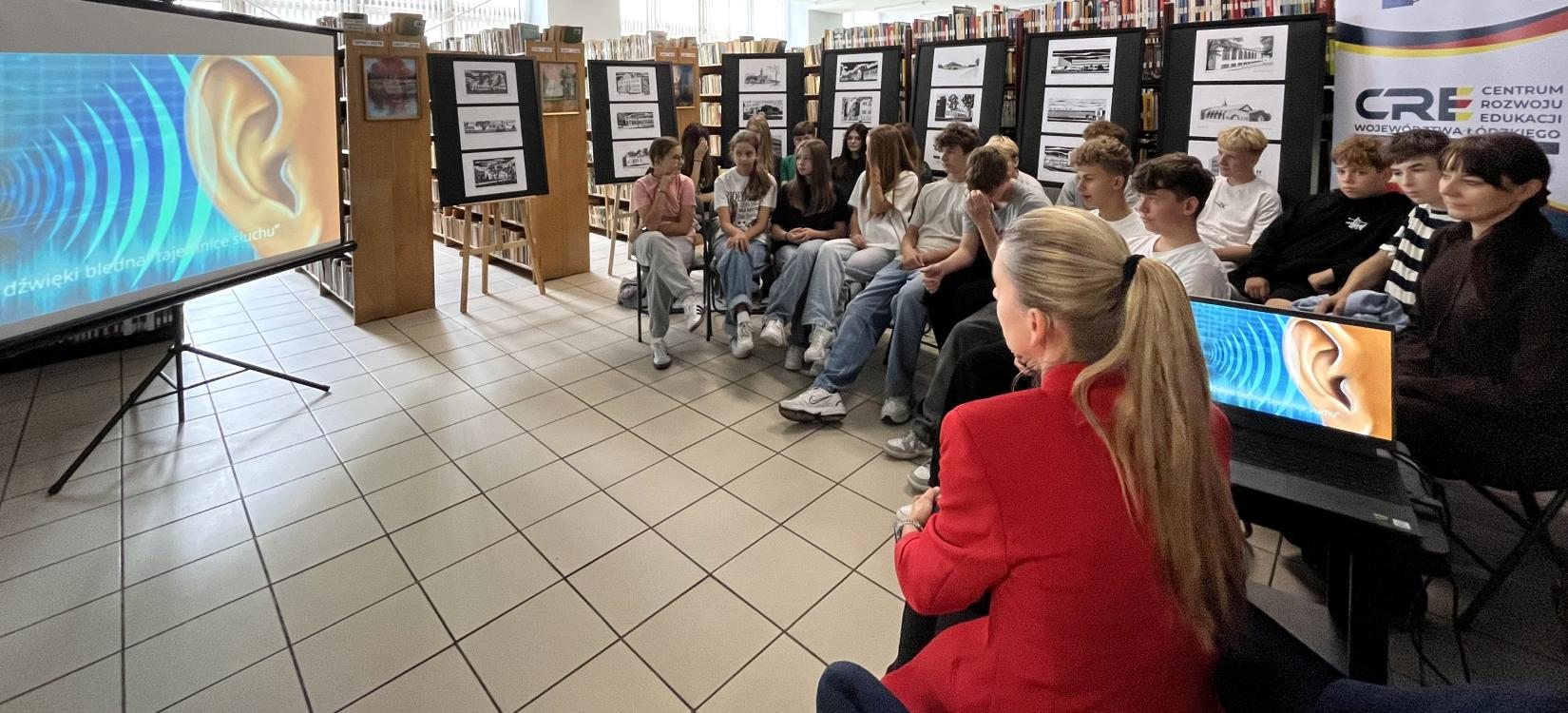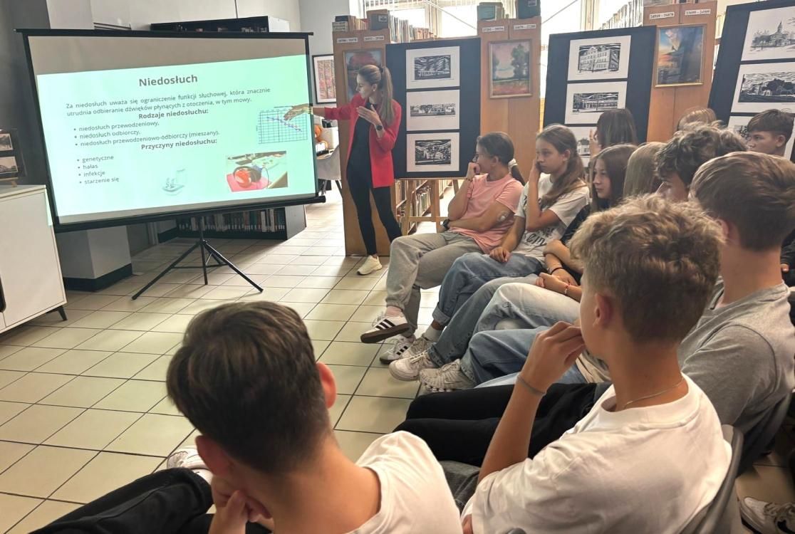 19 września w naszej Bibliotece uczniowie ósmej klasy ze Szkoły Podstawowej nr 10 w Zduńskiej Woli uczestniczyli w wyjątkowych zajęciach poświęconych zmysłowi słuchu. Podczas spotkania dowiedzieli się, jak zbudowane jest ludzkie ucho i w jaki sposób odbiera ono dźwięki. Rozmawiali o tym, co może powodować niedosłuch oraz jak rozpoznać jego pierwsze objawy. Zajęcia stały się okazją do refleksji nad tym, jak ważna jest profilaktyka – od unikania zbyt głośnej muzyki, po dbanie o higienę uszu. Dużym zainteresowaniem cieszyła się część praktyczna, podczas której uczniowie poznali podstawowe znaki języka migowego oraz alfabet palcowy. Dzięki temu mogli lepiej zrozumieć, jak osoby z niedosłuchem porozumiewają się na co dzień. Była to niezwykle ciekawa i interaktywna lekcja, która łączyła teorię z praktyką i pokazała, że o słuch warto dbać każdego dnia.