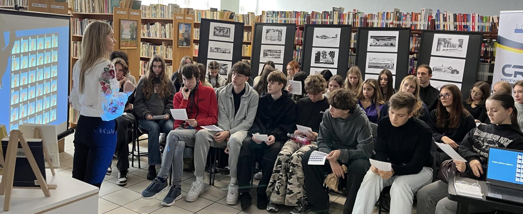 Co roku w ostatnią niedzielę września obchodzony jest Międzynarodowy Dzień Głuchych i Języka Migowego. Święto uchwaliła Światowa Federacja Głuchych w 1958 r. i ma na celu zwrócenie uwagi na problemy, prawa, obawy i osiągnięcia osób niesłyszących. Z tej okazji w Naszej Bibliotece w dniu 01 października 2025 r. odbyły się zajęcia poświęcone tej tematyce, w której udział wzięli uczniowie pierwszej klasy Technikum Logistycznego i Technikum Mechanicznego z Zespołu Szkół Zawodowych nr 1 oraz uczniowie trzeciej klasy z I Liceum Ogólnokształcącego w Zduńskiej Woli. Uczestnicy spotkania poznali zwyczaje, savoir-vivre, kulturę i ogólną wiedzę o funkcjonowaniu osób niepełnosprawnych słuchowo. Podczas zajęć młodzież poznała alfabet palcowy i kilka podstawowych znaków Polskiego Języka Migowego ( PJM), który służy do komunikowania się osób niesłyszących jak i słyszących. Naszym gościom udało się zamigać w PJM „ Dzień dobry, lubię bibliotekę”.