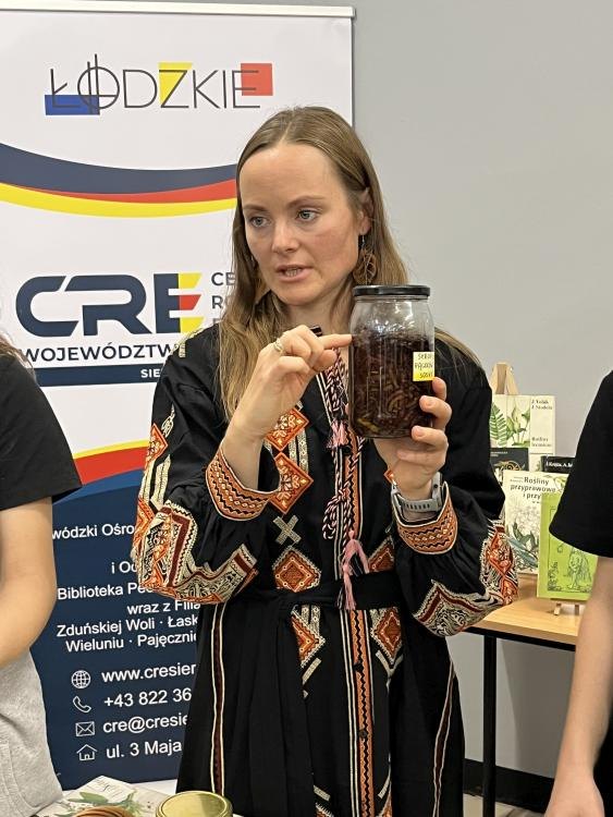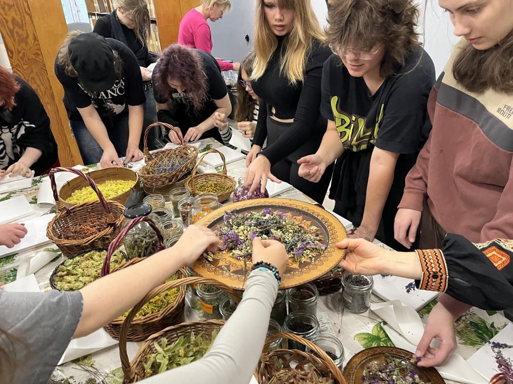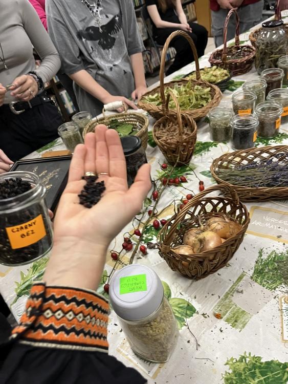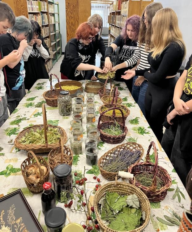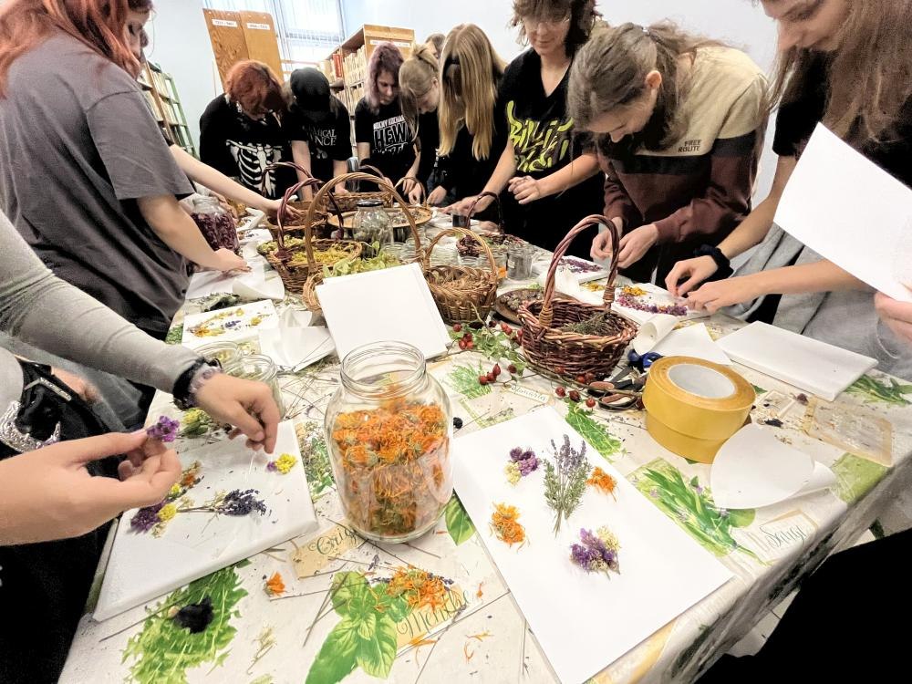 Dziś odbyły się w naszej Bibliotece wyjątkowe warsztaty ziołowe z udziałem uczniów klasy I z Państwowego Liceum Sztuk Plastycznych w Zduńskiej Woli. Spotkanie poprowadziła PANI OD ZIÓŁ Monika Woźniak – miłośniczka i znawczyni ziół, która przywiozła ze sobą prawdziwe bogactwo natury. Podczas zajęć młodzież poznała ogólną wiedzę o ziołach wspierających odporność, mogła powąchać, dotknąć różnych suszonych roślin, a także napić się pysznych herbatek ziołowych. Część artystyczna warsztatów również zachwyciła – uczniowie wykonali prace plastyczne na płótnie, do których wykorzystali prawdziwe zioła i rośliny, tworząc niezwykłe, naturalne kompozycje.