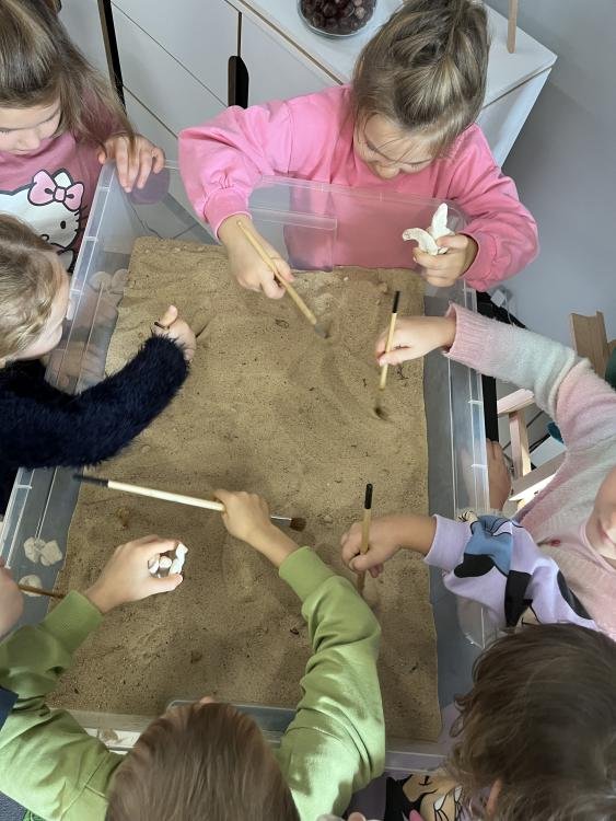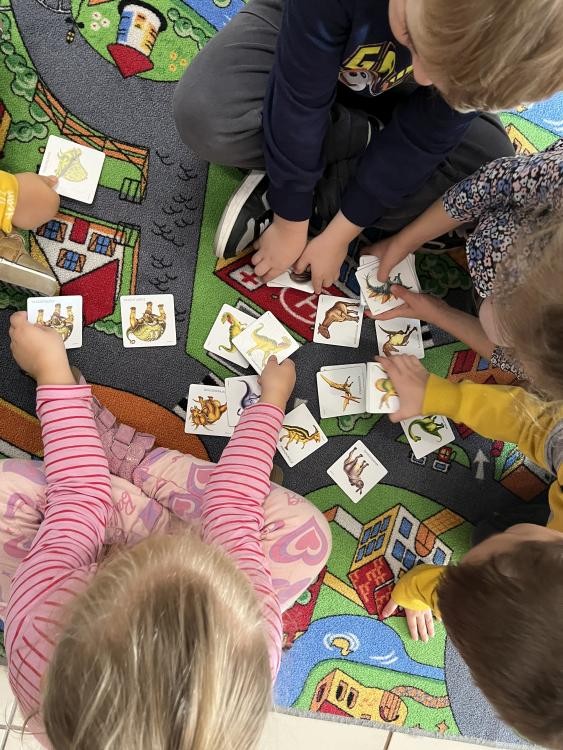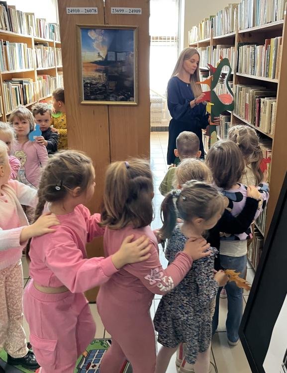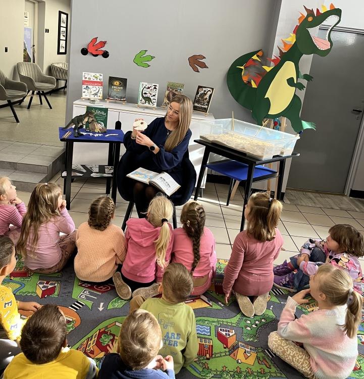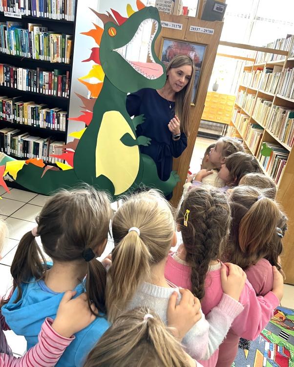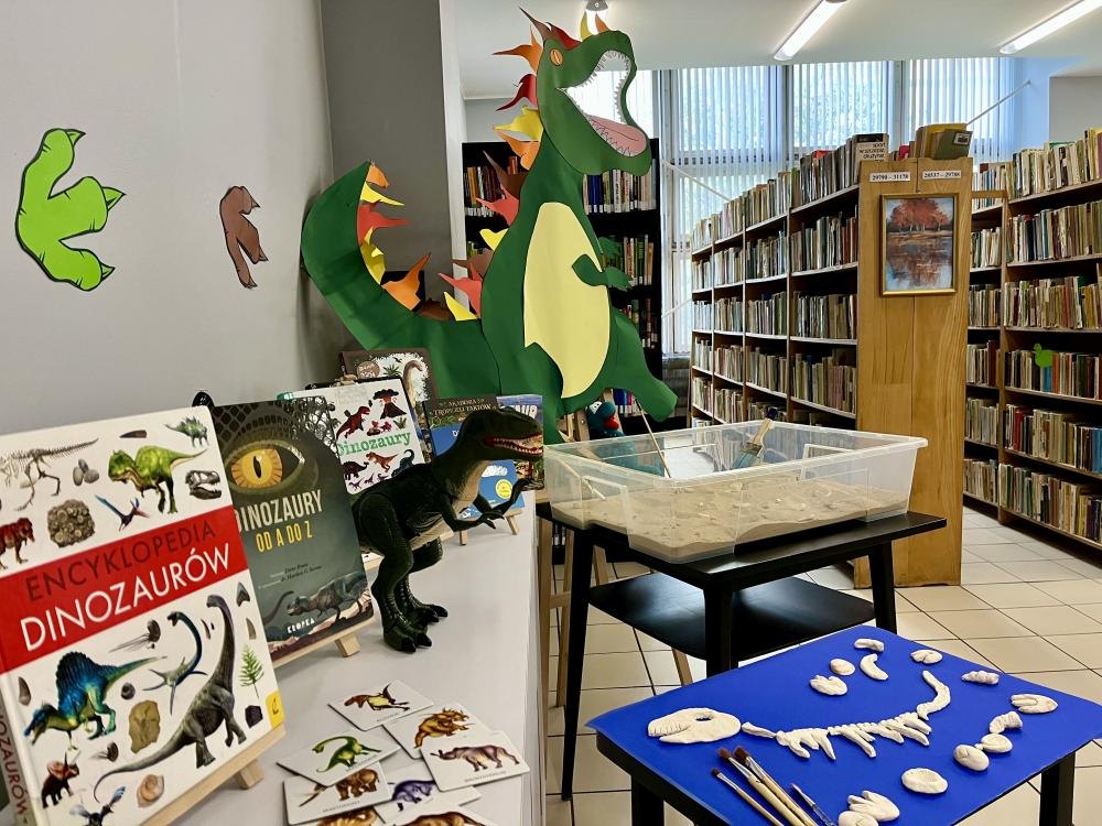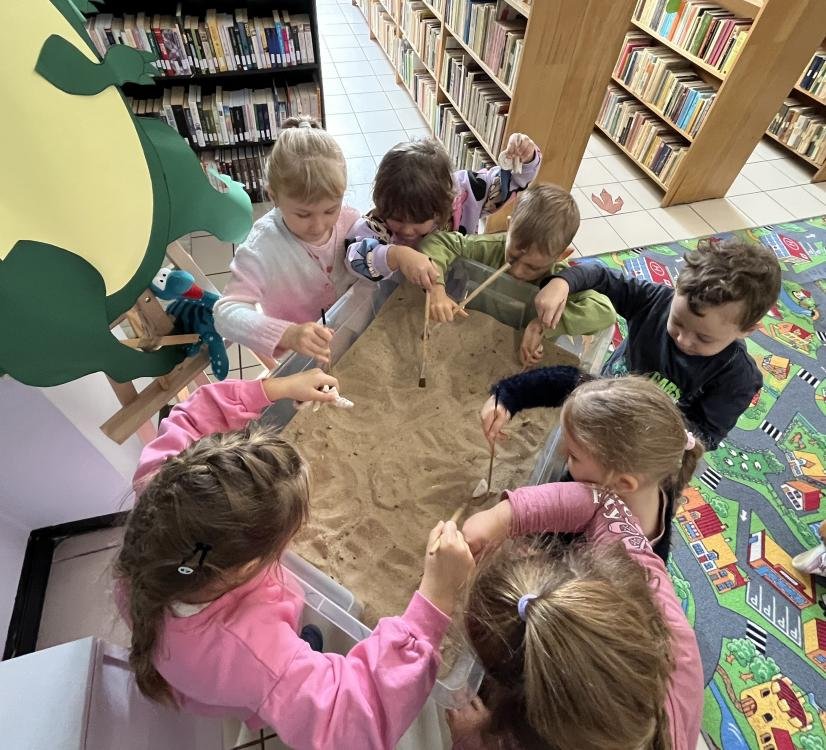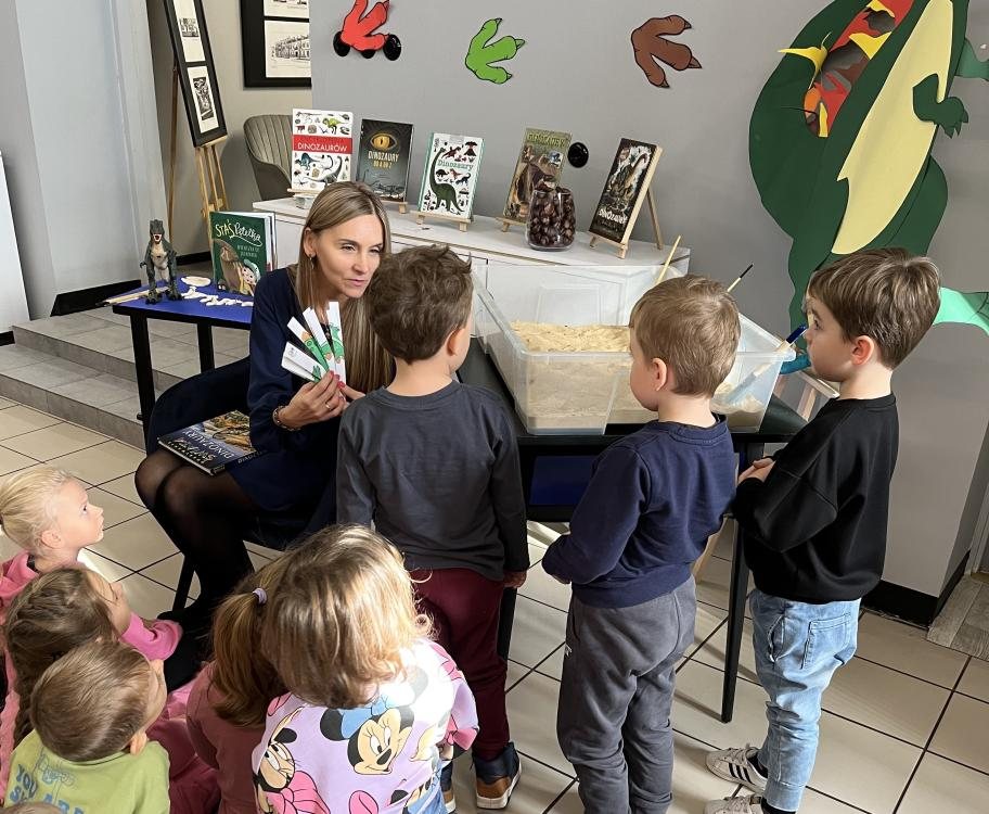 13 października 2025 r. w naszej Bibliotece odbyła się lekcja biblioteczna, która przeniosła dzieci z Publicznego Przedszkola nr 6 w Zduńskiej Woli w fascynujący świat prehistorii. Na początku spotkania uczestnicy wysłuchali opowiadania o dinozaurach, poznając ciekawostki o ich życiu i zwyczajach. Następnie dzieci z zapałem układały puzzle przedstawiające różne gatunki tych ogromnych gadów. Ogromną radość sprawiła im zabawa w paleontologa, podczas której mieli okazję wydobyć z piasku skamieliny wykonane z masy solnej. Niesamowitą atrakcją był przemarsz naszego bibliotecznego Dinozaura przez pomieszczenia naszej Biblioteki. Spotkanie przebiegło w miłej i twórczej atmosferze, rozwijając ciekawość poznawczą dzieci oraz zachęcając je do sięgania po książki o dinozaurach i przyrodzie.