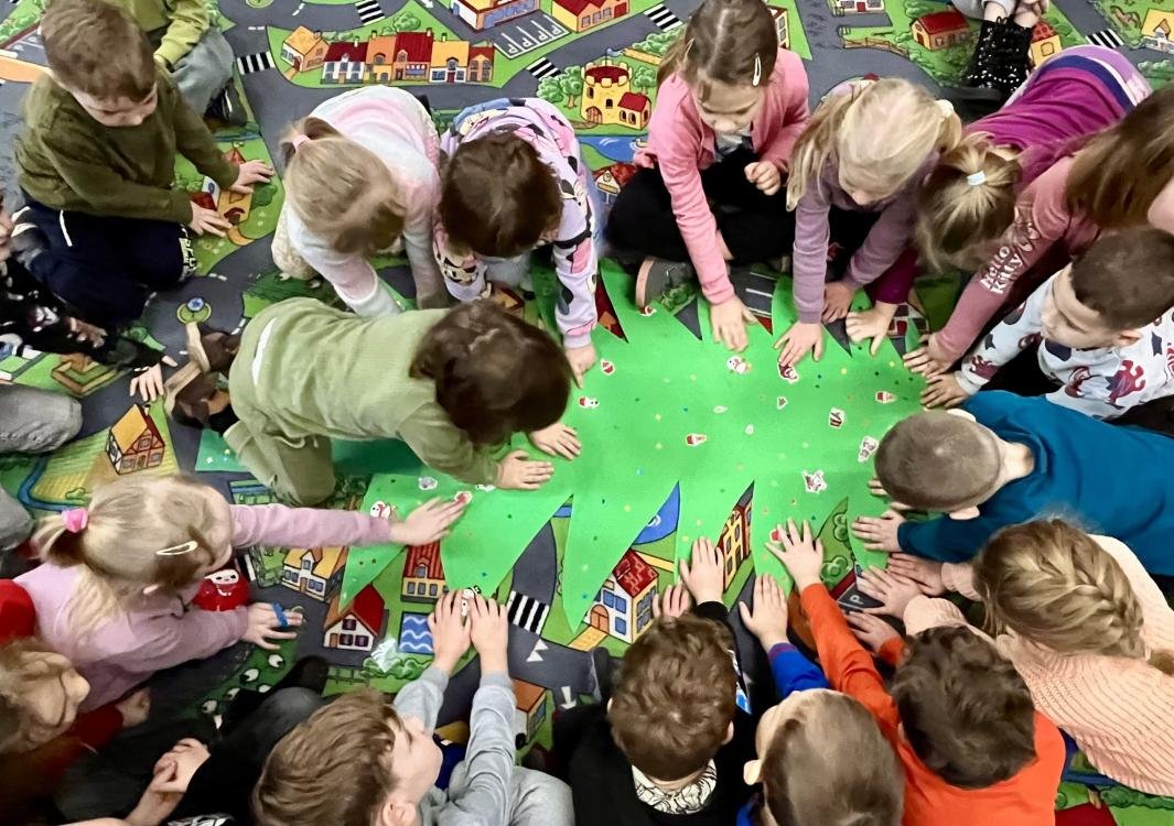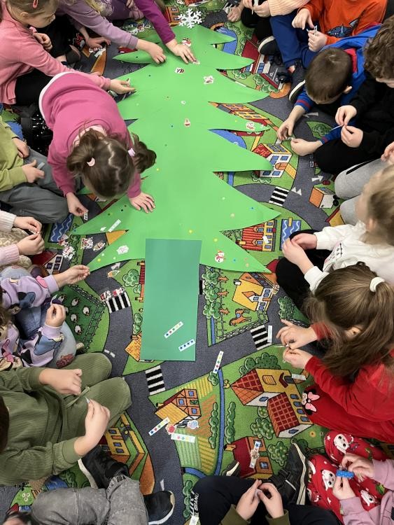 Po bajkowej podróży przyszedł czas na twórczą zabawę – wspólnie stworzyliśmy kolorową choinkę pełną świątecznych życzeń, marzeń i uśmiechów. Ten wyjątkowy kolaż dziecięcej wyobraźni przypomina nam wszystkim, jak ważne jest dzielenie się dobrem i ciepłem, szczególnie w tym magicznym czasie.